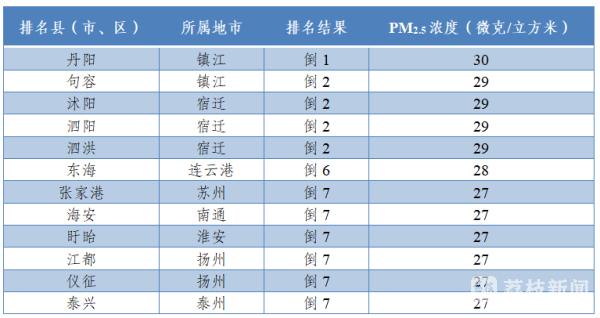 PM2.5浓度相对较差的后10位(倒1-10名)依次是:丹阳、句容(沭阳、泗阳、泗洪并列)、东海、张家港(海安、盱眙、江都、仪征、泰兴并列)。