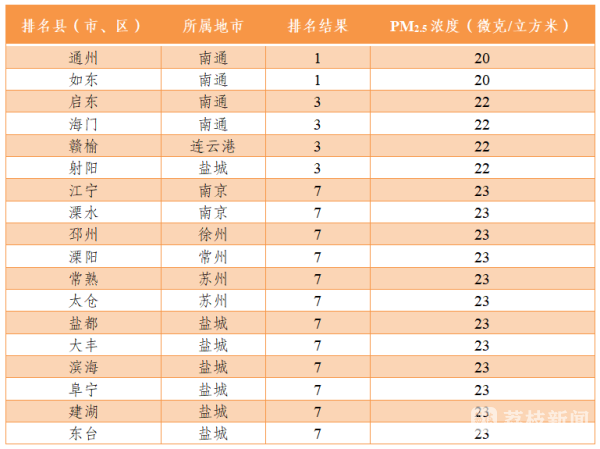 今天(6月23日),江苏省生态环境厅公布了今年5月全省县(市、区)环境空气质量排名,54个县(市、区)中PM2.5浓度相对较好的前10位(1-10名)依次是:通州(如东并列)、启东(海门、赣榆、射阳并列)、江宁(溧水、邳州、溧阳、常熟、太仓、盐都、大丰、滨海、阜宁、建湖、东台并列)。