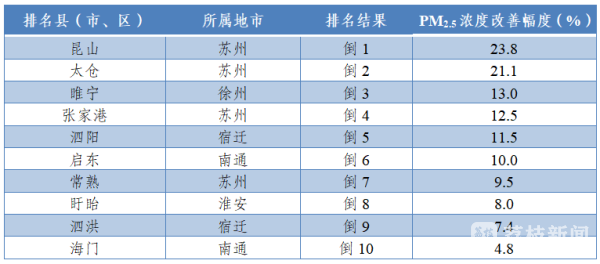 PM2.5浓度改善幅度相对较差的后10位(倒1-10名)依次是:昆山、太仓、睢宁、张家港、泗阳、启东、常熟、盱眙、泗洪、海门。