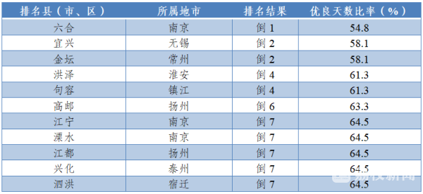 优良天数比率相对较差的后10位(倒1-10名)依次是:六合、宜兴(金坛并列)、洪泽(句容并列)、高邮、江宁(溧水、江都、兴化、泗洪并列)。