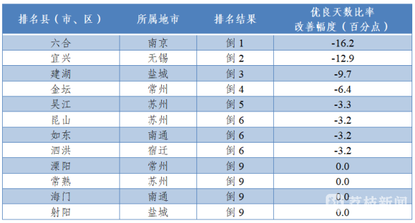 优良天数比率改善幅度相对较差的后10位(倒1-10名)依次是:六合、宜兴、建湖、金坛、吴江、昆山(如东、泗洪并列)、溧阳(常熟、海门、射阳并列)。