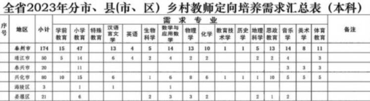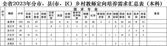 2023年江苏省乡村教师定向培养泰州计划出炉,今年安排泰州乡村定向师范生计划174人,涉及靖江、泰兴、兴化、海陵、姜堰5个市(区)。