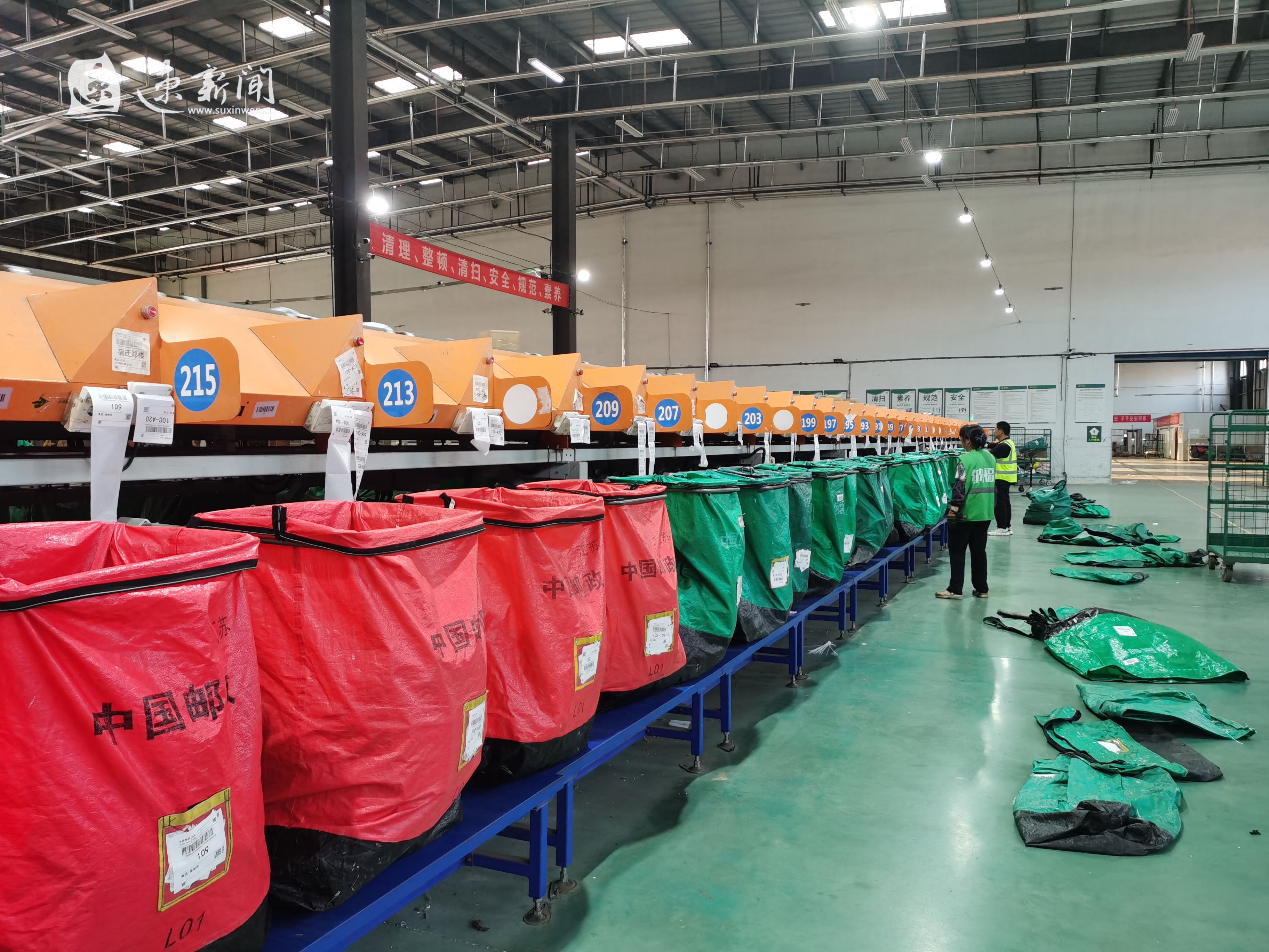6月26日,记者来到位于宿迁经开区三棵树街道的邮政邮件处理中心看到,工作人员在使用可循环中转袋分拣即将发往各处的快递。