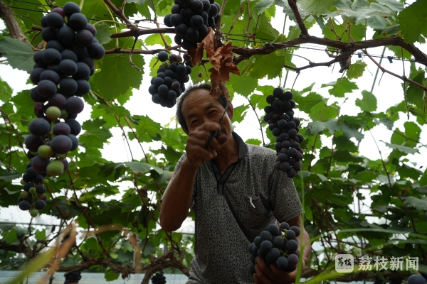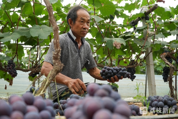 “我们家今年的夏黑有四、五十亩地,有阳光玫瑰和藤稔,夏黑比较多一点,现在主要出的是夏黑和藤稔,夏黑今年产量比较高,今年走车价格在六块五左右每斤,现在每天采摘三千斤左右。”泗洪县瑶沟乡崔庄村绿旺葡萄基地负责人陈磊高兴的对记者说。