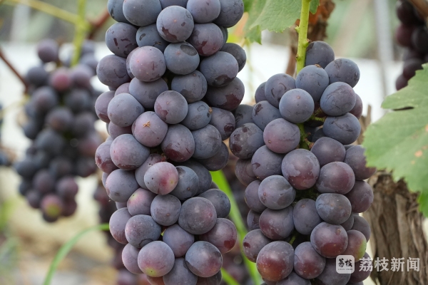 泗洪县瑶沟乡崔庄村绿旺葡萄基地,占地50余亩的葡萄大棚里,一串串果实饱满的葡萄挂满枝头,掩映在繁密的绿叶中,串串饱满,色型俱佳,散发着阵阵果香。