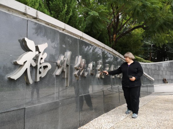 2018年10月,“鼓岭之友”穆言灵在福州三山陵园的抗日志士纪念墙前缅怀她的公公穆蔼仁。(鼓岭管委会供图)