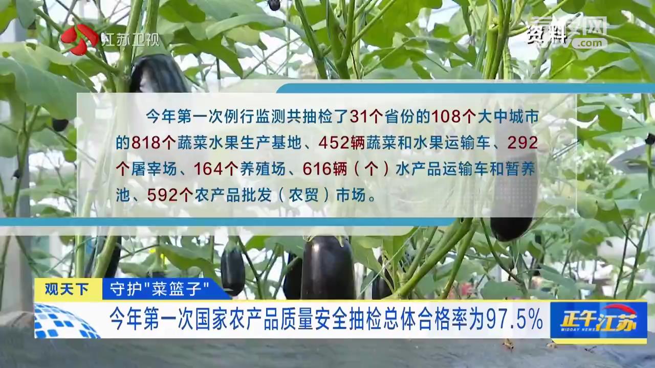 据介绍,今年第一次例行监测共抽检了31个省份的108个大中城市的818个蔬菜水果生产基地、452辆蔬菜和水果运输车、292个屠宰场、164个养殖场、616辆(个)水产品运输车和暂养池、592个农产品批发(农贸)市场。抽检蔬菜、水果、畜禽产品和水产品4大类产品96个品种。结果显示,蔬菜、水果、畜禽产品和水产品合格率分别为97.3%、96.3%、99.2%和94.7%。农业农村部已及时将监测中发现的问题通报给各地加强整改,有效治理重点品种突出问题,确保整治见到明显成效。
