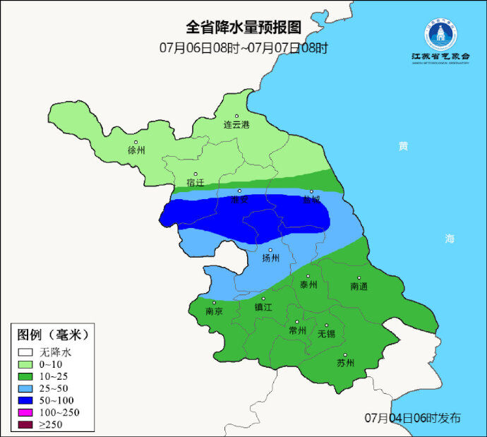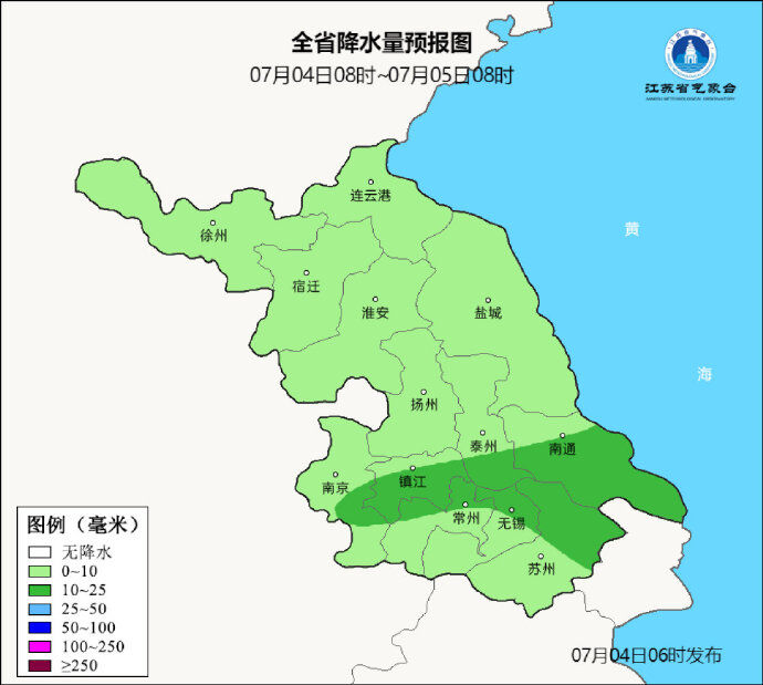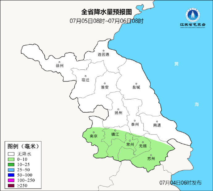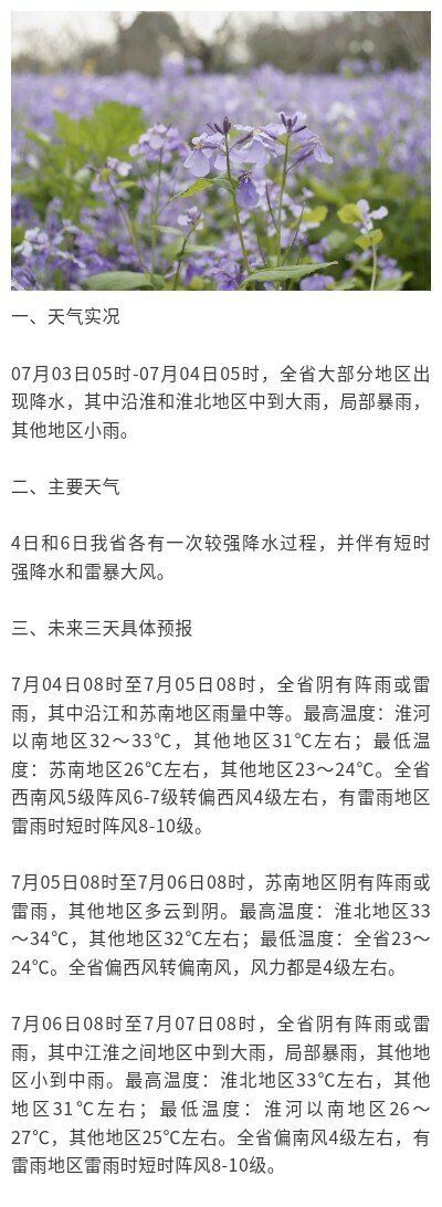 7月04日08时至7月05日08时,全省阴有阵雨或雷雨,其中沿江和苏南地区雨量中等。最高温度:淮河以南地区32~33℃,其他地区31℃左右;最低温度:苏南地区26℃左右,其他地区23~24℃。全省西南风5级阵风6-7级转偏西风4级左右,有雷雨地区雷雨时短时阵风8-10级。