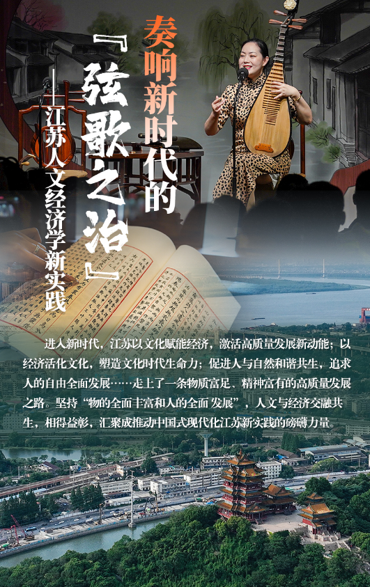 承百代之流,会当今之变;以古之规矩,开今之生面。进入新时代,江苏以文化赋能经济,激活高质量发展新动能;以经济活化文化,塑造文化时代生命力;促进人与自然和谐共生,追求人的自由全面发展……走上了一条物质富足、精神富有的高质量发展之路。坚持“物的全面丰富和人的全面发展”,人文与经济交融共生,相得益彰,汇聚成推动中国式现代化江苏新实践的磅礴力量。
