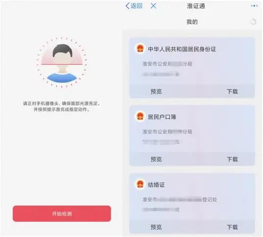 第二步:登录成功后进入证照和材料列表,个人用户可查看自然人列表,法人用户可以查看企业、项目类列表。点击“我的”页面,通过人脸识别二次认证后,将批量查询登录账号的证照材料,常用的身份证、驾驶证、结婚证、户口簿等证件的电子证照都可以查,可以预览与下载。