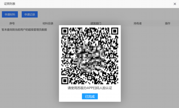 第二步:点击需要使用的证照和材料名称,打开“苏服办”APP扫描弹出框中的人脸认证二维码,通过认证后,可查询、预览、下载。