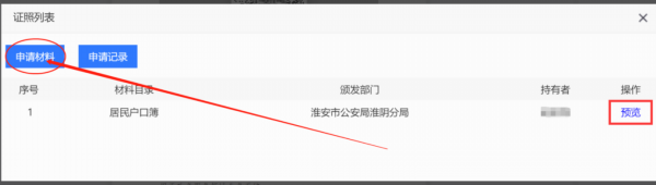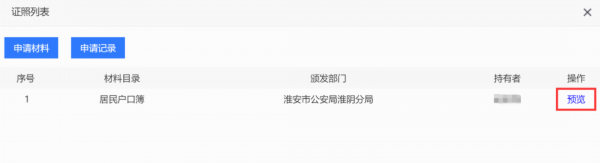 第三步:如果拥有实体证照材料但没有查到结果,可到证照材料列表中查找该数据目录,点击发起申请,由超管工作室核查数据并制作电子材料,可用于各项政务服务业务。