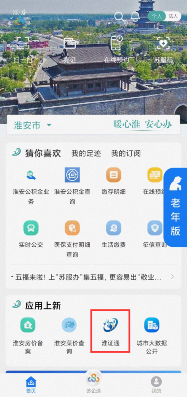 第一步:登录“苏服办”APP,选择淮安市站点,在应用上新里找到“淮证通”。