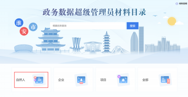 第一步:登录江苏政务网淮安旗舰店,点击“政务数据超级管理员”模块,进入政务数据超级管理员门户首页,以自然人类别为例,点击页面中自然人分类,进入自然人共享目录列表页面。