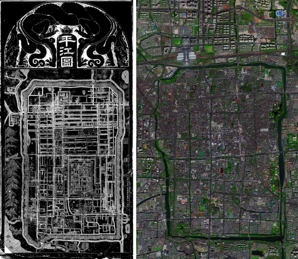 拼版照片:左图为宋代碑刻《平江图》(资料照片);右图为2023年3月拍摄的苏州古城的卫星图像。