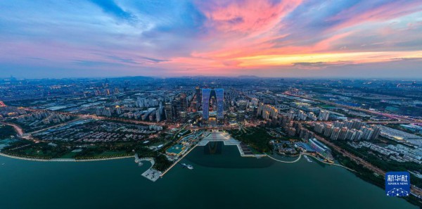 苏州工业园区东方之门(7月3日摄,无人机照片)。