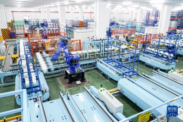 在位于苏州市吴江区盛泽镇的恒力化纤工业丝智能车间,机器人在车间内自动作业(2021年5月14日摄)。
