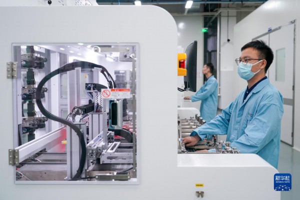 在位于苏州工业园区的苏州华兴源创科技股份有限公司,工作人员在研发车间内操作先进封装芯片测试机(7月5日摄)。