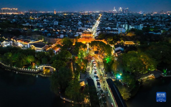 苏州阊门夜景(4月10日摄,无人机照片)。