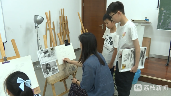 下午,在淮安市文化馆的素描教室里记者看到,十余位孩子手持画笔,对着画板,正在临摹画本上的素描图案,老师不停在孩子们中游走,指导孩子们如何正确的握笔,如何勾勒线条。学生家长张静秋告诉记者:“我觉得可以综合多方面地培养孩子的兴趣爱好,因为孩子暑期在家的话,我们也没有专业性的知识指导,所以在家就会浪费时间,这次文化馆举行的活动很丰富多样,比如说围棋、跳舞,我觉得对孩子的综合素养发展是非常有益的,目前我们家孩子学了一个舞蹈,舞蹈班孩子觉得舞蹈老师很专业,孩子自己也觉得在这里学的是有一定难度的,而不是那种非常简单的,对于她来说还是觉得有所提升的。”