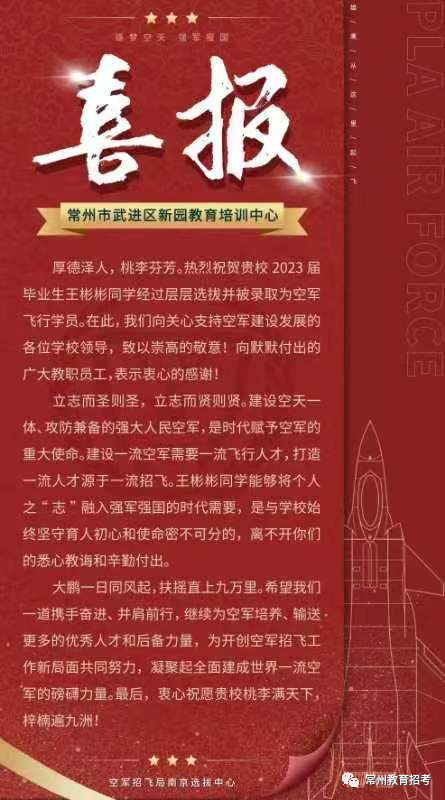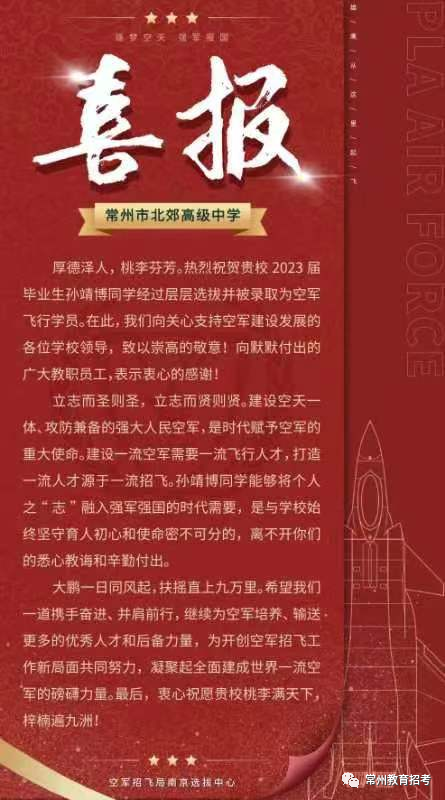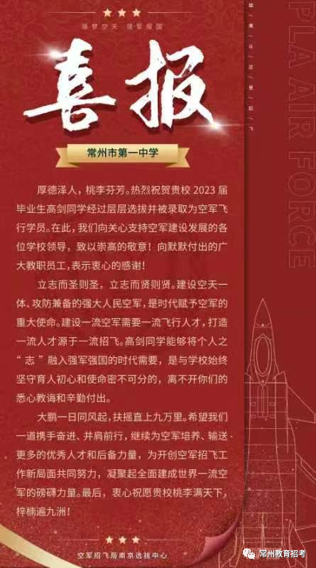 常州4名考生被光荣录取为中国人民解放军空军飞行学员!