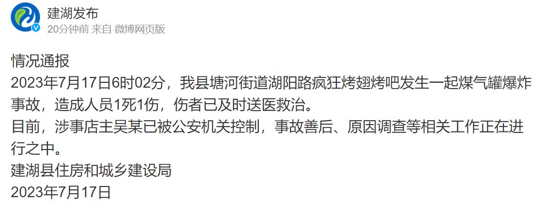 我苏客户端讯 7月17日,盐城建湖县官方微博账号“建湖发布”就当地某烧烤店爆炸事故发布情况通报: