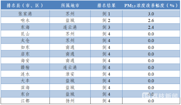 PM2.5浓度改善幅度相对较差的后10位(倒1—10名)依次是:张家港、响水、东海、昆山(太仓、如东、启东、海安、赣榆、涟水、大丰、滨海、东台、江都并列)。