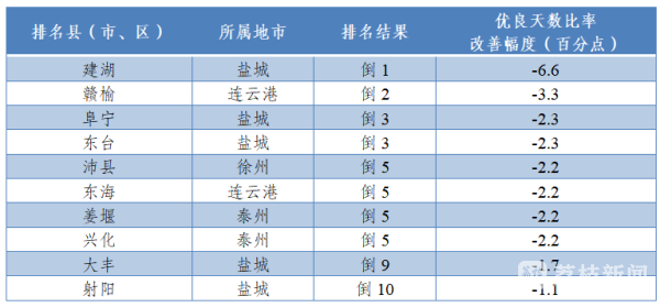 优良天数比率改善幅度相对较差的后10位(倒1—10名)依次是:建湖、赣榆、阜宁(东台并列)、沛县(东海、姜堰、兴化并列)、大丰、射阳。