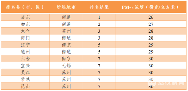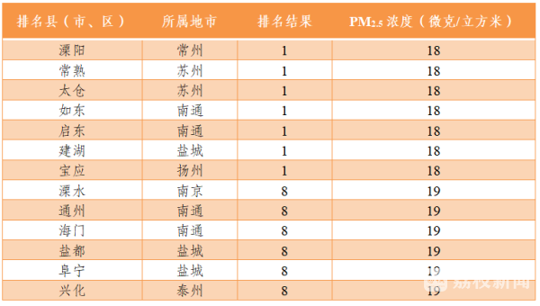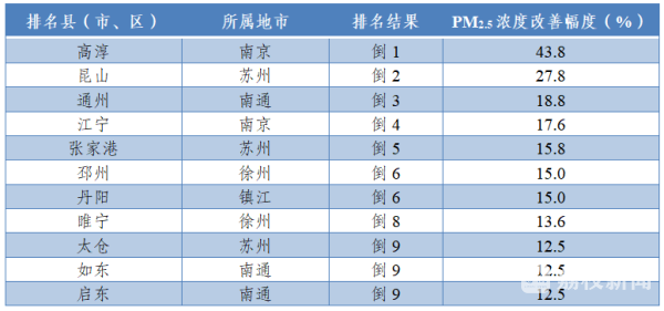 PM2.5浓度改善幅度相对较好的前10位(1—10名)依次是:溧阳、宜兴、六合、靖江、江宁、溧水、金湖、高淳(金坛、宝应并列)。