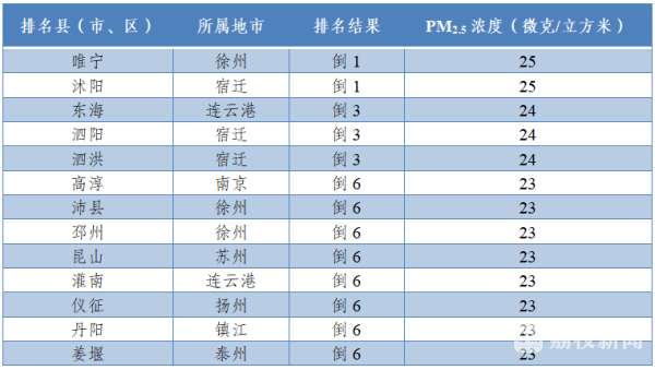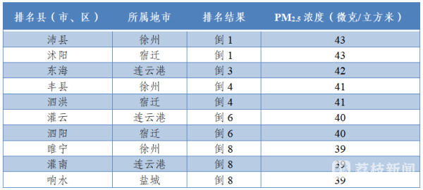PM2.5浓度相对较差的后10位(倒1—10名)依次是:沛县(沭阳并列)、东海、丰县(泗洪并列)、灌云(泗阳并列)、睢宁(灌南、响水并列)。