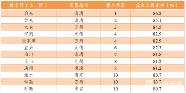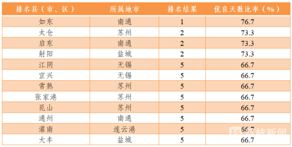 优良天数比率相对较好的前10位(1—10名)依次是:启东、如东、太仓、江阴(张家港并列)、宜兴、海门、昆山(通州并列)、溧水(常熟、盱眙并列)。
