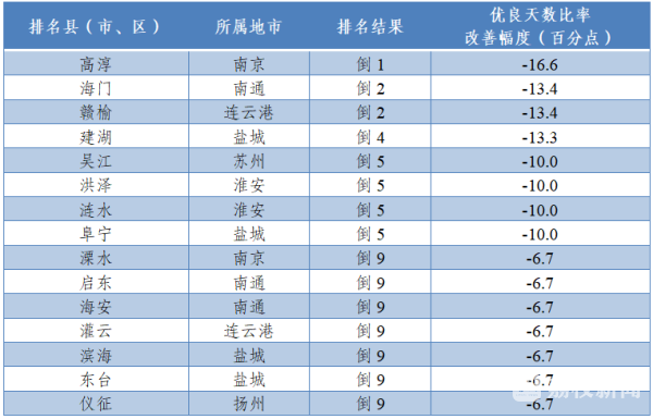 优良天数比率改善幅度相对较差的后10位(倒1—10名)依次是:高淳、海门(赣榆并列)、建湖、吴江(洪泽、涟水、阜宁并列)、溧水(启东、海安、灌云、滨海、东台、仪征并列)。