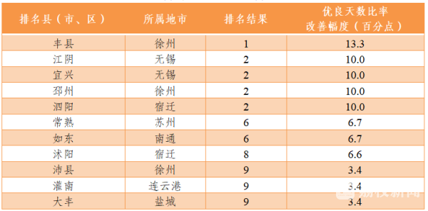 优良天数比率改善幅度相对较好的前10位(1—10名)依次是:丰县、江阴(宜兴、邳州、泗阳并列)、常熟(如东并列)、沭阳、沛县(灌南、大丰并列)。