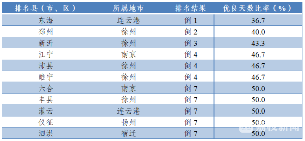 优良天数比率相对较差的后10位(倒1—10名)依次是:东海、邳州、新沂、江宁(沛县、睢宁并列)、六合(丰县、灌云、仪征、泗洪并列)。