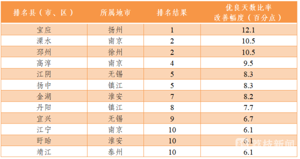 优良天数比率改善幅度相对较好的前10位(1—10名)依次是:宝应、溧水(邳州并列)、高淳、江阴(扬中并列)、金湖、丹阳、宜兴、江宁(盱眙、靖江并列)。