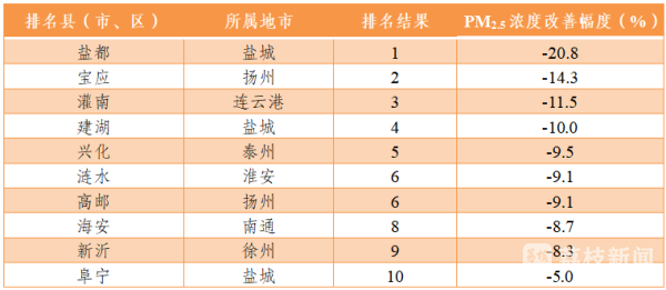 PM2.5浓度改善幅度相对较好的前10位(1—10名)依次是:盐都、宝应、灌南、建湖、兴化、涟水(高邮并列)、海安、新沂、阜宁。