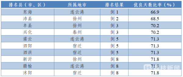 优良天数比率相对较差的后10位(倒1—10名)依次是:东海、沛县、丰县(兴化并列)、灌云(泗阳、泗洪并列)、新沂(赣榆、沭阳并列)。