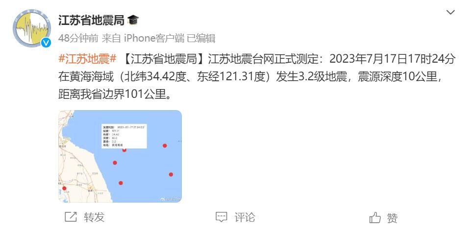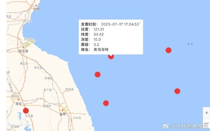 我苏客户端讯 江苏地震台网正式测定:2023年7月17日17时24分在黄海海域(北纬34.42度、东经121.31度)发生3.2级地震,震源深度10公里,距离我省边界101公里。