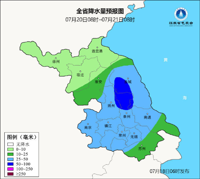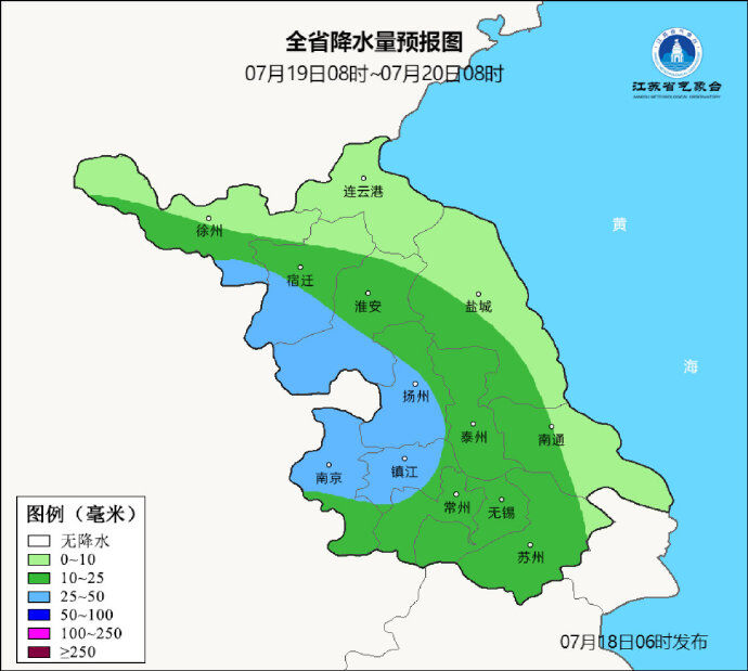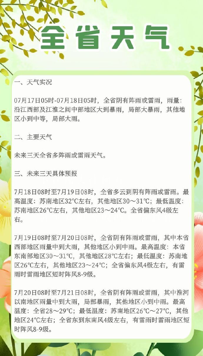 7月18日08时至7月19日08时,全省多云到阴有阵雨或雷雨。最高温度:苏南地区32℃左右,其他地区30~31℃;最低温度:苏南地区26℃左右,其他地区23~24℃。全省偏东风4级左右。
