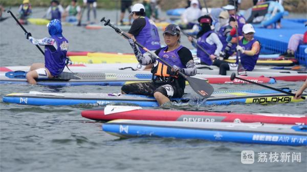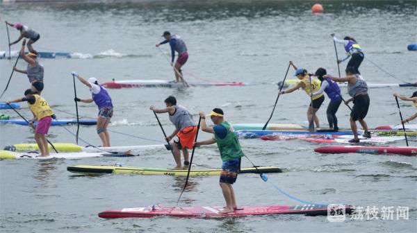 伴随着比赛哨声的吹响,在水面上排列整齐的桨板像一支支离弦的箭一样划过水面,留下一道道水痕。选手们在湖上逐浪竞波,卯足了劲儿疾如蛟龙,奋力向前发起冲击,呈现出一幅桨板百舸争流的画卷。