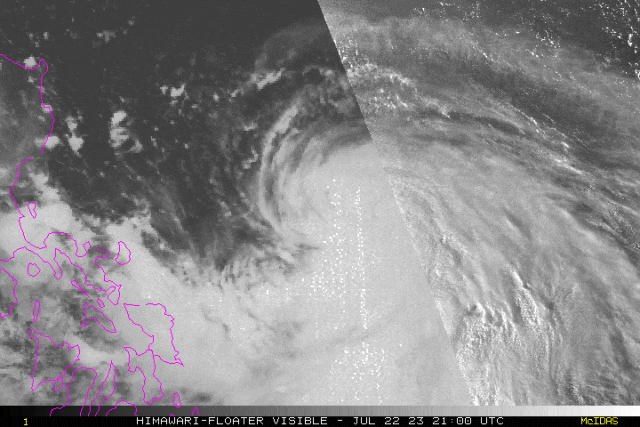 ▲葵花-8号卫星监测到的第5号台风“杜苏芮”可见光云图动画(时间段:2023年7月23日05时00分至23日12时00分)