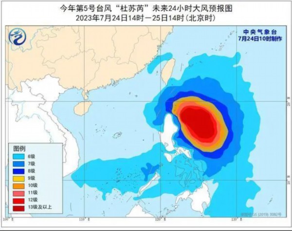 今年第5号台风“杜苏芮”(DOKSURI)已于今天(24日)上午8点钟由台风级增强为强台风级,其中心位于我国台湾省鹅銮鼻东南方大约940公里的菲律宾吕宋岛以东洋面上,就是北纬15.4度、东经126.6度,中心附近最大风力有14级(42米/秒),中心最低气压955百帕,七级风圈半径300—360公里,十级风圈半径100—160公里,十二级风圈半径50—70公里。