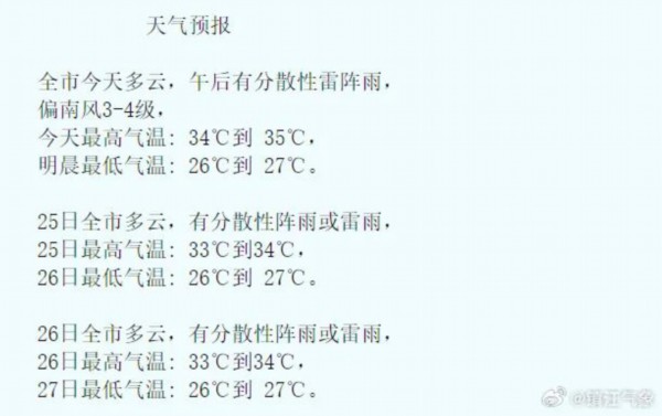 预计24日至26日,镇江以晴到多云天气为主。气温回升,24日至25日最高气温可达34℃左右;27日至29日,受今年第5号台风“杜苏芮”影响,镇江将有明显风雨天气过程。