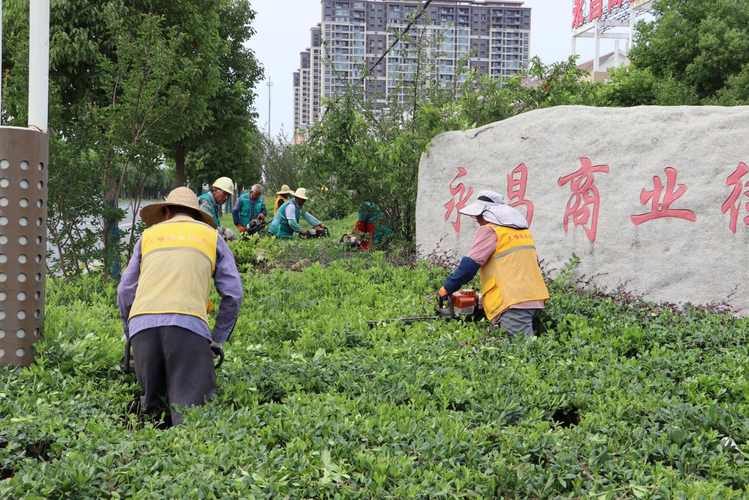初夏时节,在江苏省淮安市盱眙县太和社区永昌商业街,园林景观有限公司的员工正在对道路两旁的绿化灌木进行修剪。“听家里人说社区成立了绿化管护公司,我便从南京返乡应聘,现在不仅能就近照顾家里,一个月也有四五千元的稳定收入。”朱长宝说。