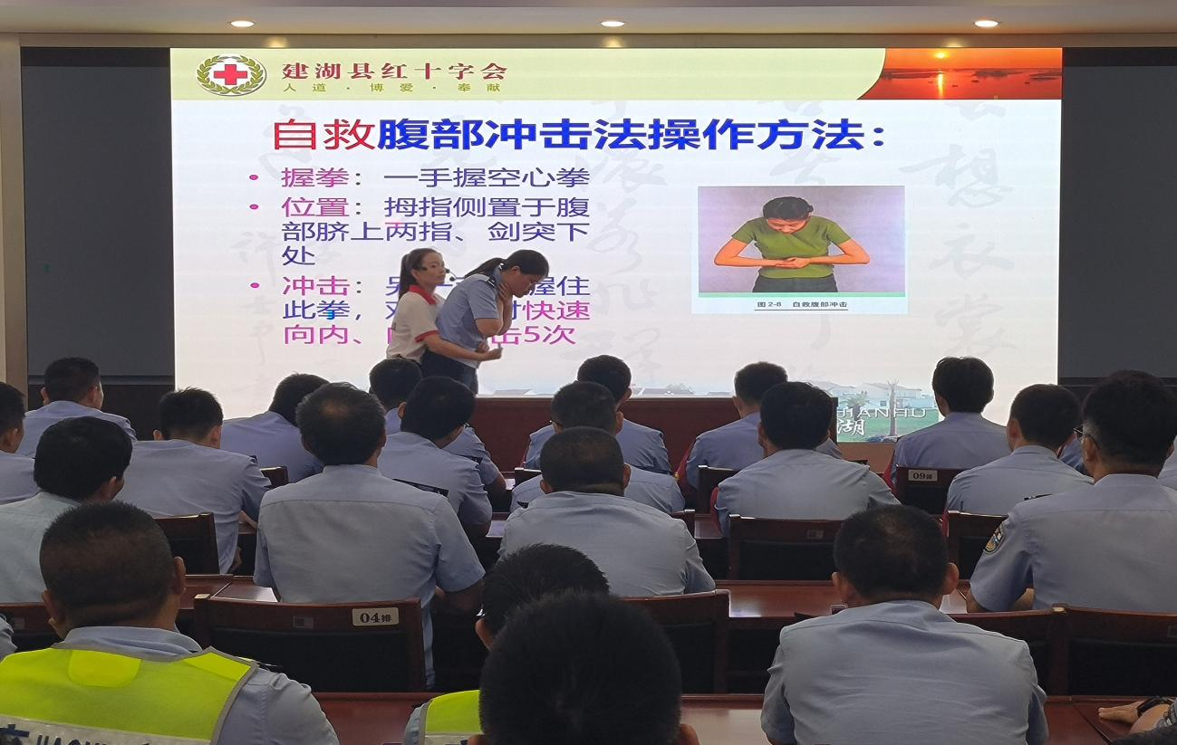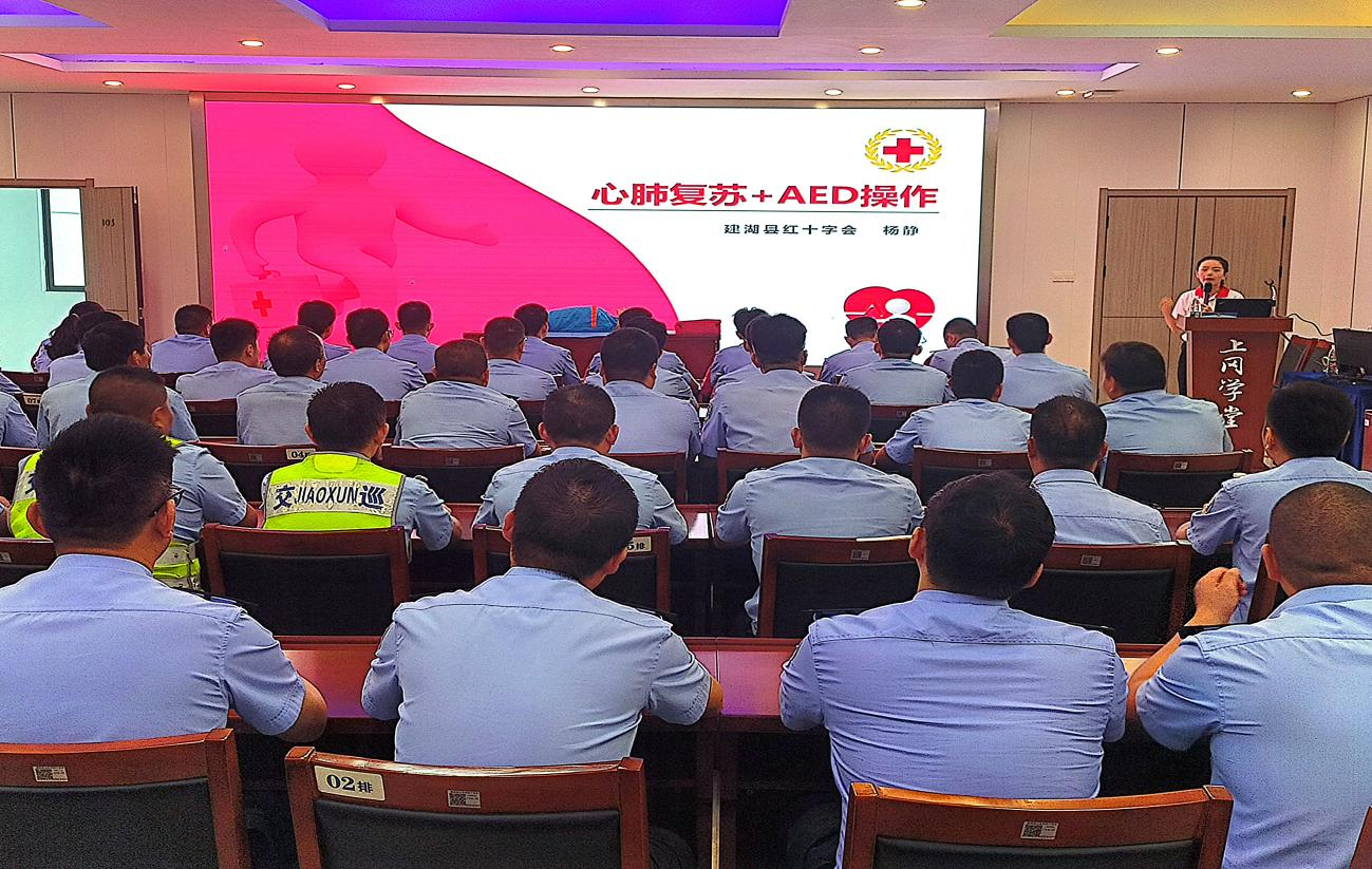 为进一步提高全县民警安全防范意识和自救互救能力,积极助力警察队伍保障人民群众身体健康和生命安全,7月27日,盐城市建湖县红十字会为全县18个派出所和交巡警大队共50名一线民警开展应急救护技能培训。