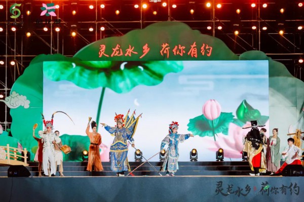 建湖县新时代文明实践中心在九龙口度假区举行第二届荷花文化艺术节暨夜生活节,以“淮潮新韵 非遗有戏”为主题,邀请22位中国戏剧梅花奖获奖艺术家一齐亮相淮剧小镇,展示非遗传统文化。