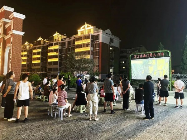 盐都区潘黄街道新时代文明实践所在夜间开设“红色影院”,向来往市民传播红色能量,激发群众爱国热情。