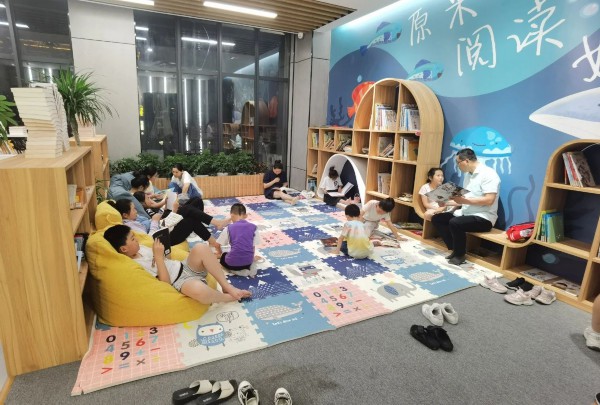 滨海县新时代文明实践中心一楼城市书房晚间免费向市民开放,不少家长带着孩子阅读打卡。
