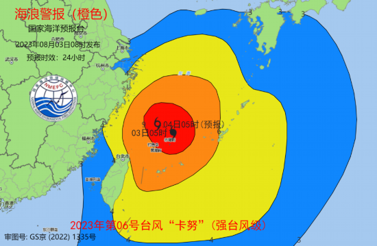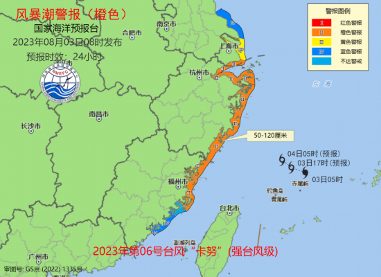 随着台风“卡努”最大影响我国沿岸的时段临近,预计8月3日上午至4日中午,江苏南通到福建厦门沿海将出现50到120厘米的风暴增水。上海市、浙江省嘉兴市、绍兴市、宁波市、舟山市、台州市、温州市和福建省宁德市、福州市的风暴潮预警级别为橙色;江苏省南通市、福建省泉州市和厦门市的风暴潮预警级别为蓝色。国家海洋预报台提醒,由于受台风影响岸段的天文潮较高,需要重点关注夜间沿海的天文大潮时段。国家海洋预报台将密切关注,同时提醒沿海政府及相关部门按照职责做好防御风暴潮的应急准备工作。