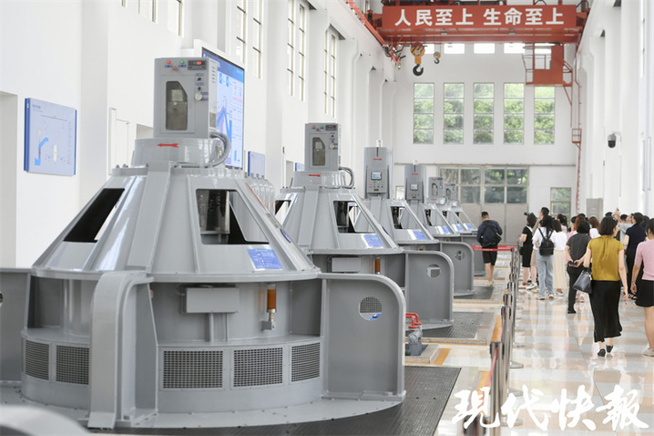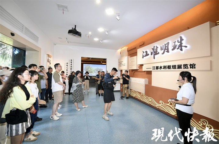 在现场,通过视频讲解和沙盘的演示,记者们了解了江都水利枢纽的七大功能,分别是抽江北送、自流引江、抽排涝水、分泄洪水、余水发电、保障航运、改善生态环境等。